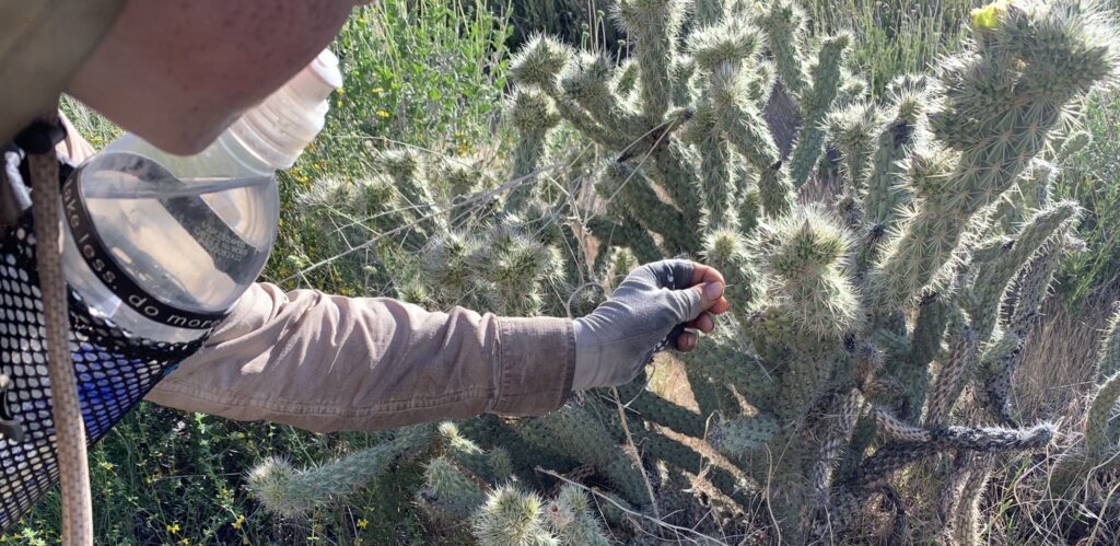 Strong gusts seem to come out of nowhere and push us sideways. Dad actually got blown into cholla cactus! These cacti already kind of jump, so he really copped it bad. The needles even went through his pant leg, OUCH! The needle extraction was really slow and painful. I pulled about a dozen really fine ones out for him using the tweezers on my Swiss army knife. They were hard to see and I accidentally pulled a hair or two out along the way. I think those ones might have hurt him more 🙂